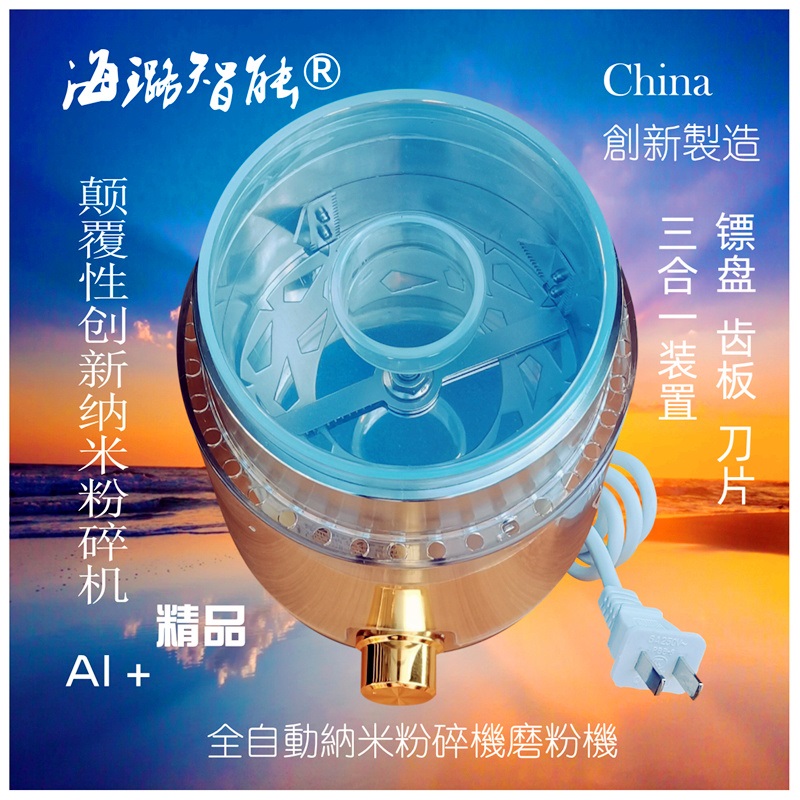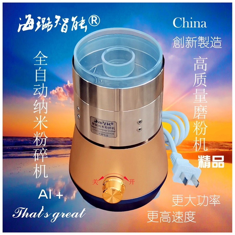 海璐智能纳米粉碎机世间先得全自动风选定时液氮降温高质量磨粉机产品名称:新型纳米粉碎机 工作原理:专利号ZL2019216997846 设备类型:高速气流粉碎机(磨粉机) 产品特点:600目2万目纳米级 可择机择细 若拍新款:AI定时磨粉 分选粗与细 产品型号:HLZN001-060 系列 产品材质:304不锈钢 非定量商品 按件包装 产品功率:正常磨粉600W 电压110V/220V 电机转速:28000r/min 产能与入料干燥度成正比 入料干燥:>99% 少含油 不含胶 硬度<46HRC 自动清理:旋盖 套袋 开机 瞬间自动清理干净 操作提示:亲 规范操作 开机时注意离手 产品质保:按说明书使用 按国规维护 用户体验:操作越正确 磨粉越快 越细 越好 海璐智能产品祝福语: 海璐智能全自动智能纳米粉碎机的研发成功,将为人类健康给予好的享受与体验,给予人类思维方式的更新以及行事方式的现代化。 海璐智能全自动智能纳米粉碎机,助予您事业成功,助予您及家人健康、美丽、聪明。长寿,助于您关爱生命,幸福一生。